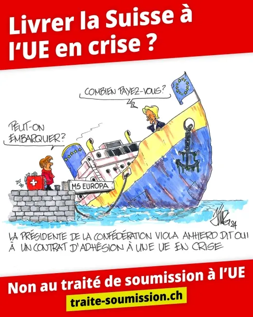 Livrer la Suisse à l’UE en crise ?Livrer la Suisse à l’UE en crise, à des juges étrangers et payer des milliards à Bruxelles pour ça ? Certainement pas, Madame la Présidente de la Confédération Viola Amherd !Pour une Suisse indépendante et prospère : Non au traité de soumission à l’UE !