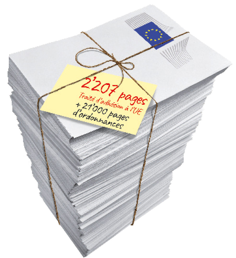 L’ensemble du dossier des traités de l’UE compte 2’207 pages. Les traités renvoient en outre à différents arrêts de la CJCE, à des directives européennes et à des règlements de l’UE. En les suivant, on se retrouve dans une jungle bureaucratique européenne de quelque 20’897 pages de textes réglementaires.